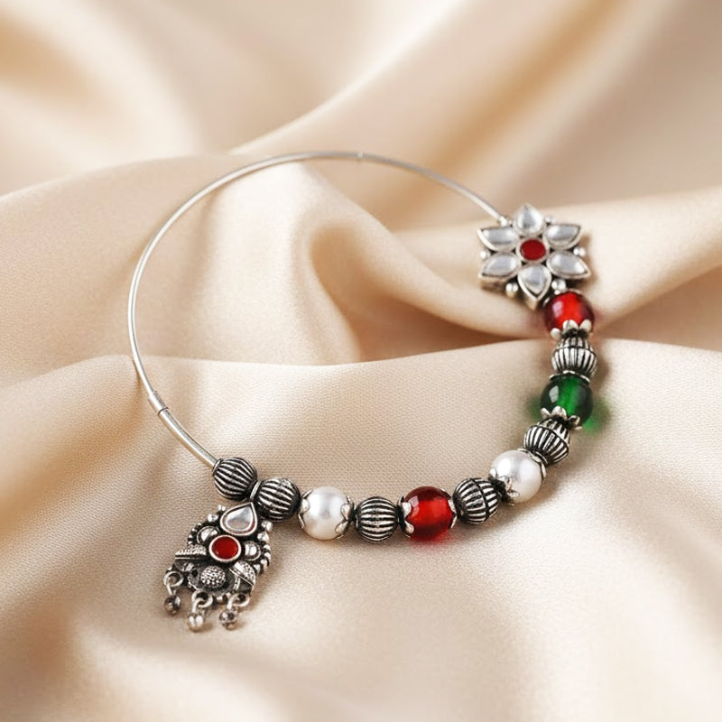 Inspired by the seed and bead arrangements found in Uttarakhand traditional jewels, this silver nath has a balanced sequence of colored stones and pearls. The red and green stones reflect auspicious beginnings, while the pearls symbolize purity. Floral silver accents provide a ceremonial finish. The round design provides both comfort and authenticity. It is handcrafted in silver and is suitable for both festive and heritage decor.