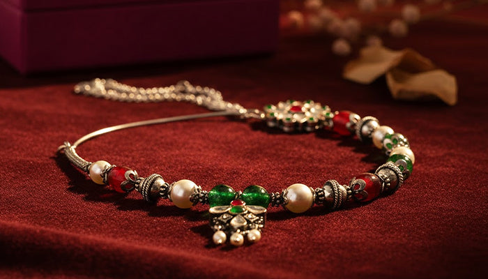 Celebrated in Uttarakhand’s Garur region, this nath carries the visual language of bridal and ceremonial adornment. The floral stone settings reflect festivity and abundance, while the rhythmic bead sequence symbolizes balance and continuity, making it a meaningful ornament associated with marriage, celebration, and cultural pride.