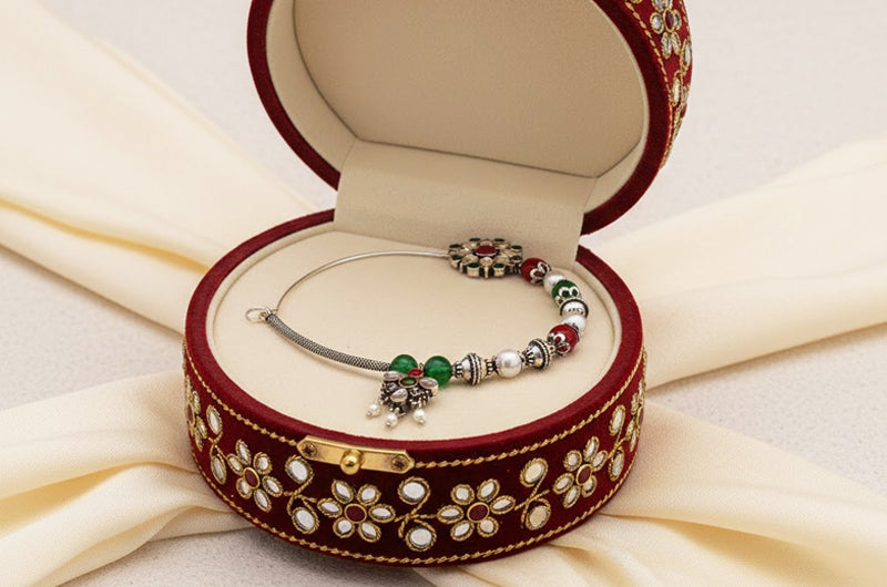 Shaped through traditional silversmithing practices, this nath showcases careful stone setting, bead alignment, and curved silver forming. Crafted entirely by hand, each element preserves regional jewellery techniques, transforming Garur’s folk ornament traditions into a refined heritage piece rooted in Uttarakhand’s living craft legacy.