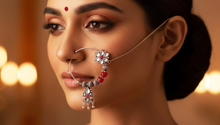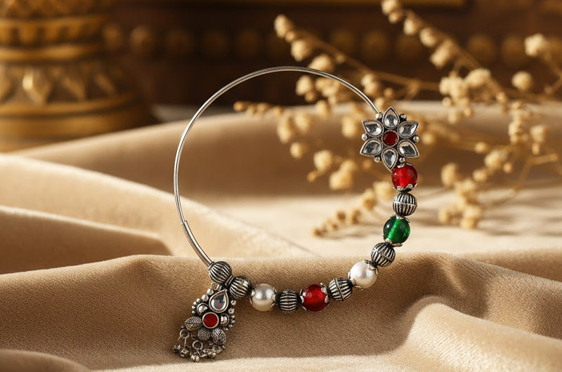 A traditional silver nath inspired by seed-and-bead patterns of Uttarakhand folk jewellery.