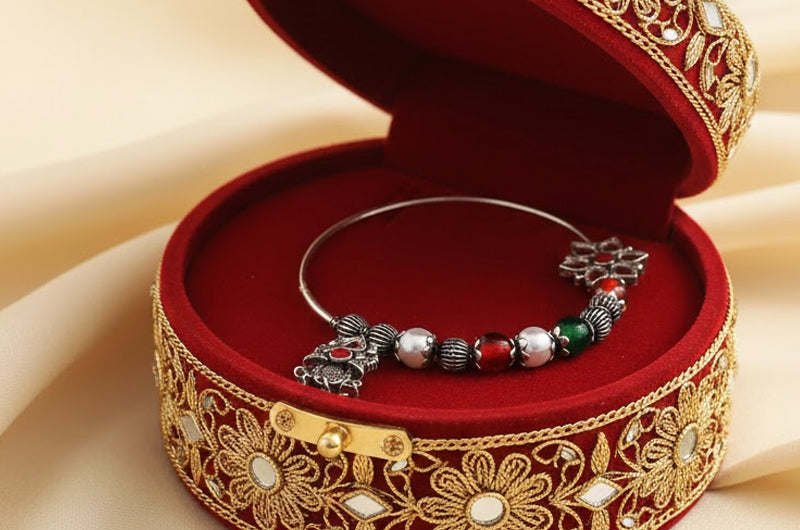 Silver jewellery should be worn after applying makeup, perfume, or lotions to avoid chemical contact. Keep it away from water, sweat, and harsh substances, and remove it before bathing, exercising, or sleeping. When not in use, store the jewellery in a dry, airtight pouch to prevent tarnishing. Clean gently with a soft, dry cloth after wear. Natural tarnishing may occur over time and can be easily restored with proper polishing.