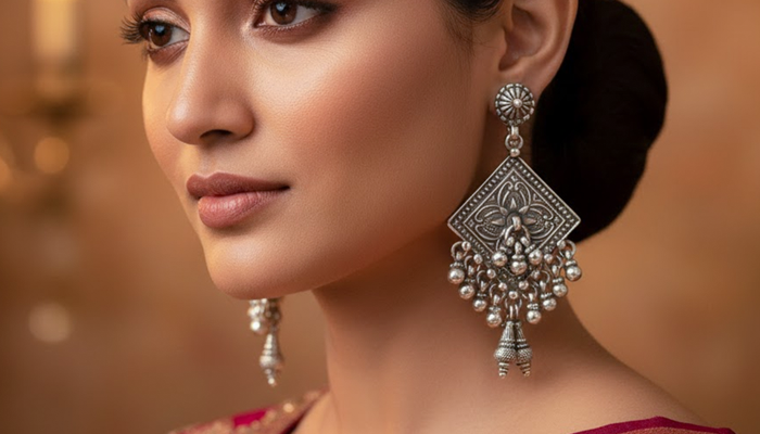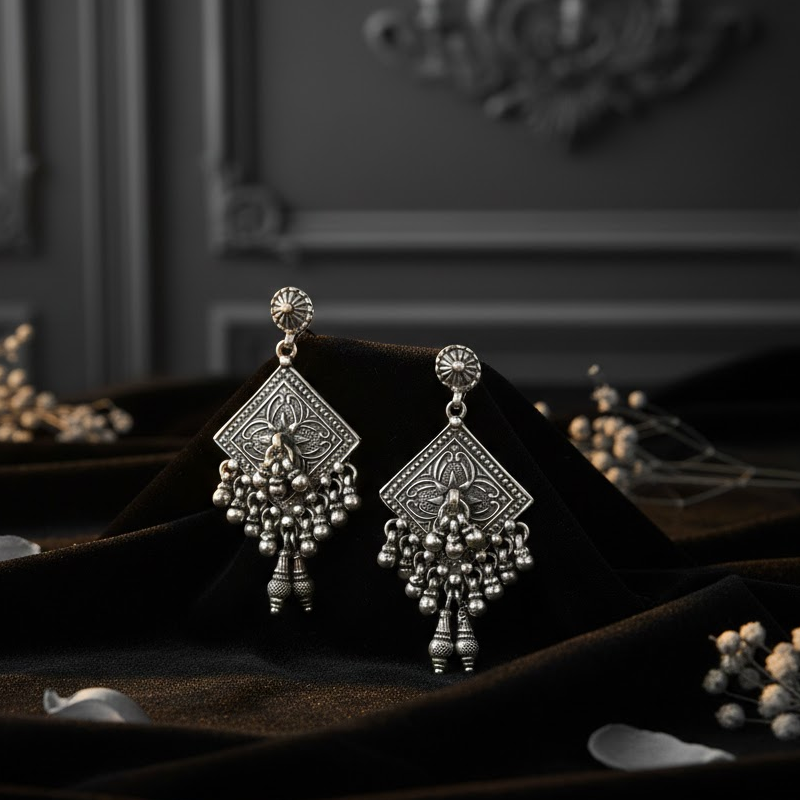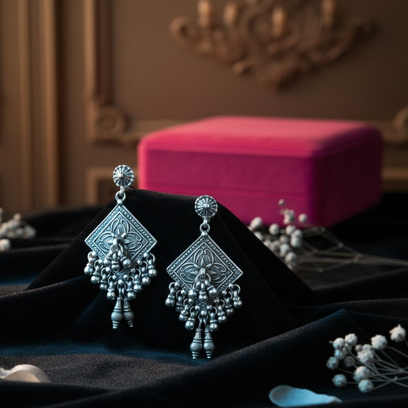 Inspired by the quiet resilience of alpine primroses, this jhumki reflects renewal, delicacy, and continuity in UttarakhandÂ’s mountain ecology. The seed-like silver spheres symbolize fertility and growth, translating the natural cycles of hill valleys into a refined ornament rooted in folk symbolism and everyday ritual beauty.