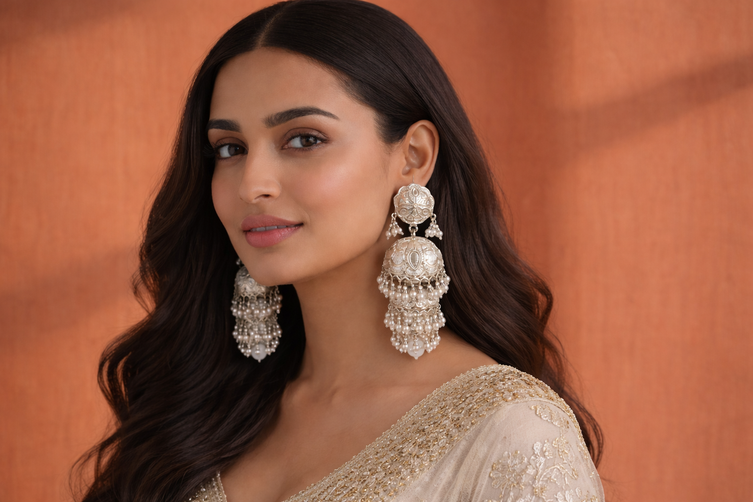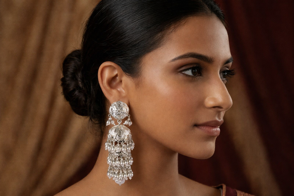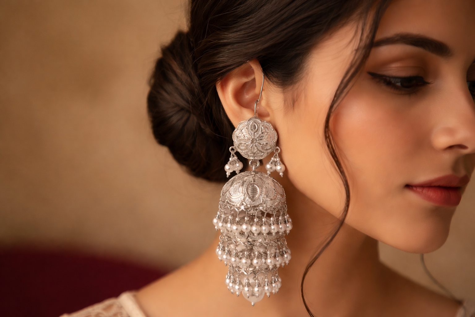 Majestic multi-layered silver jhumkis inspired by the timeless elegance of Uttarakhand’s royal heritage.