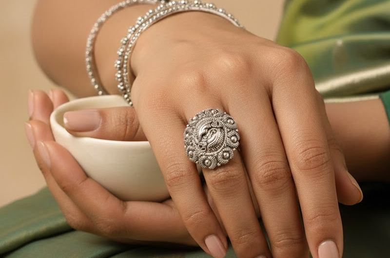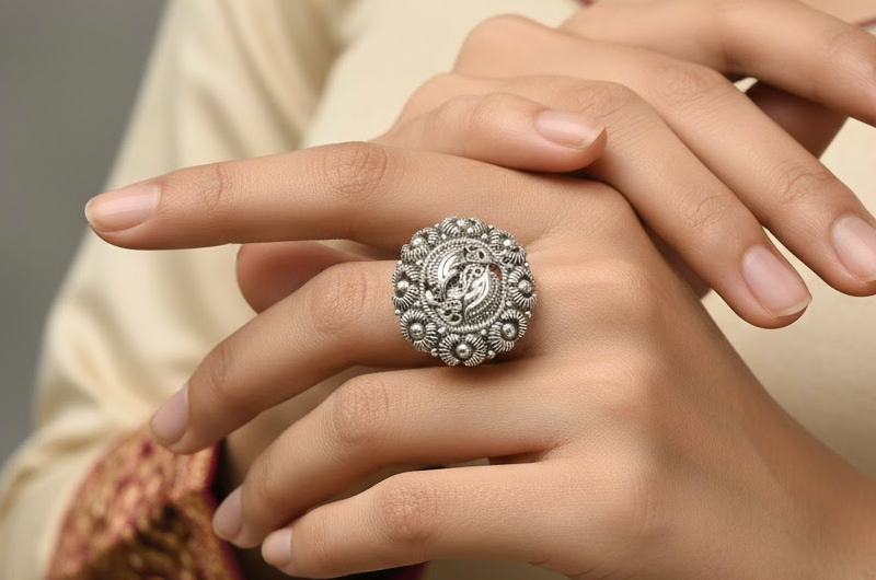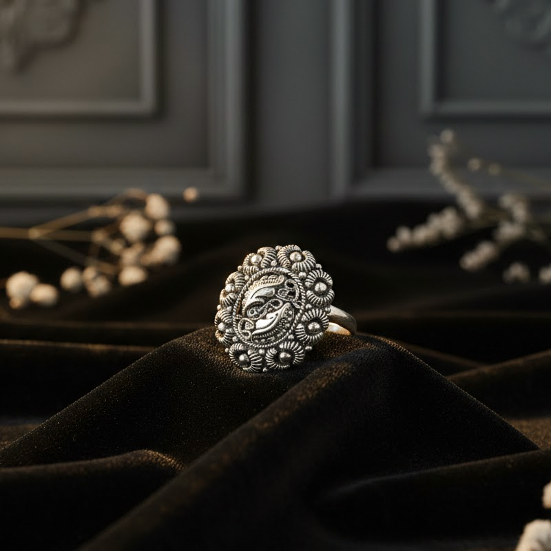 Handcrafted by expert Pahadi silversmiths, the ring combines layered shaping, spiral engraving, and raised detailing. Each element preserves traditional hill craftsmanship, transforming natural motifs into a durable, wearable piece that captures Uttarakhand’s dynamic environment and artisanal heritage.