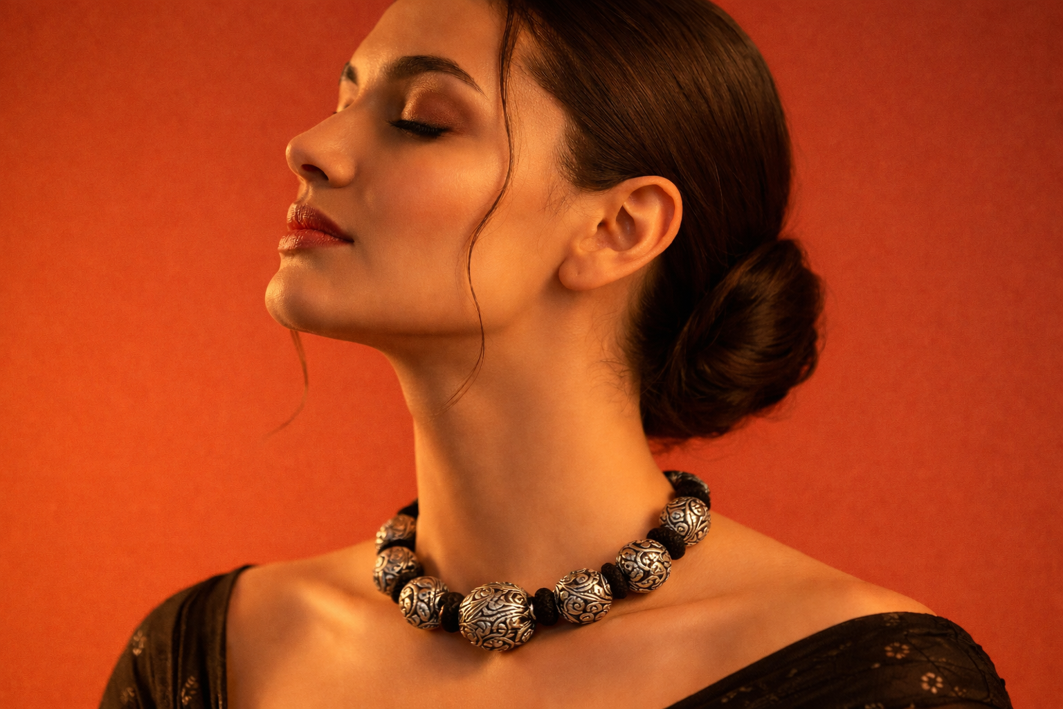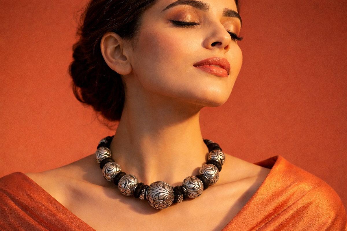 Rooted in India’s rich jewelry traditions, engraved silver bead necklaces symbolize strength, prosperity, and timeless beauty. Historically worn during celebrations and sacred occasions, such designs represent protection and positive energy. The detailed scroll patterns reflect centuries-old craftsmanship passed through generations. Wearing this piece is not just about adornment—it is about embracing cultural pride and heritage.