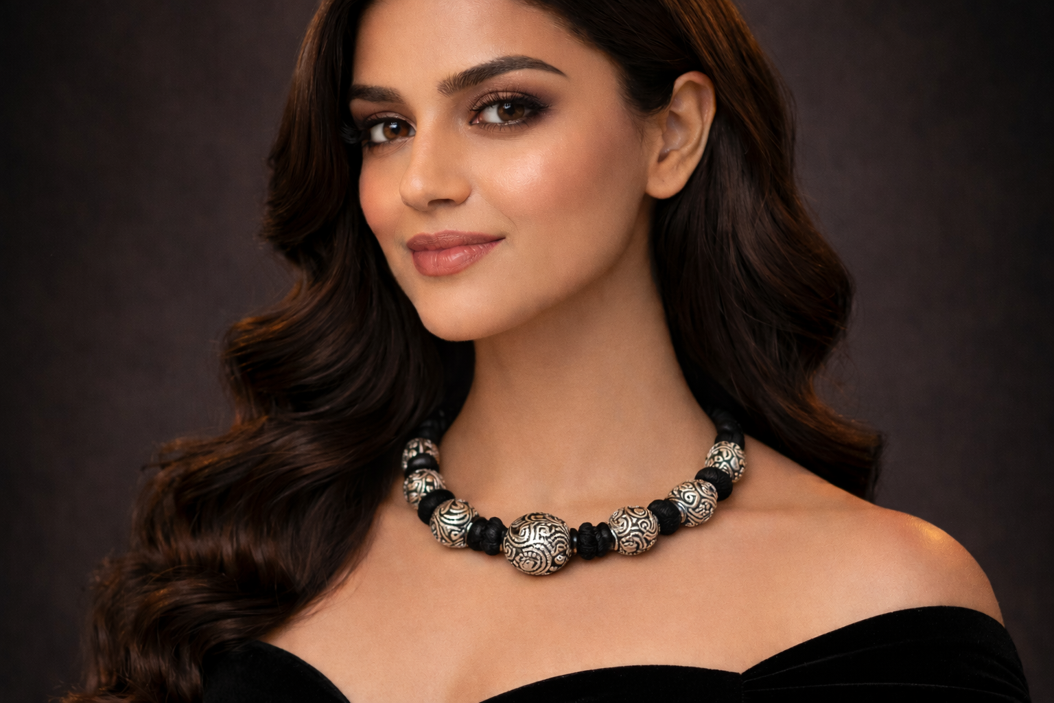 The Vrinda Viraasat Silver Bead Necklace is a tribute to traditional artistry and cultural grandeur. Adorned with intricately engraved silver-toned beads, each element showcases delicate scrollwork inspired by classic Indian motifs. The rich black thread detailing enhances its bold aesthetic while ensuring comfortable wear. Perfect for festive gatherings, weddings, or statement styling, this necklace effortlessly blends tradition with contemporary grace. A piece designed to be cherished across generations.